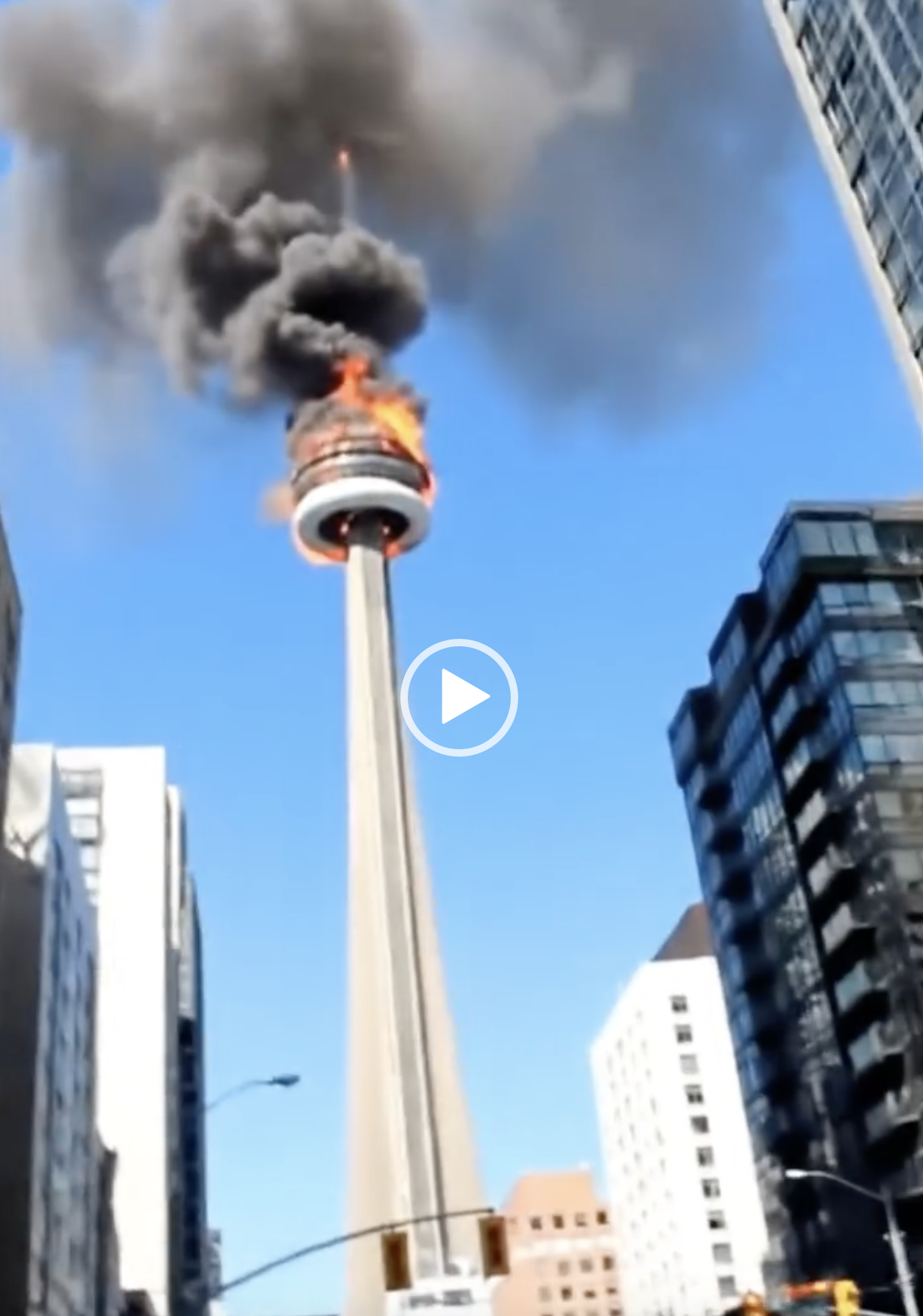Imagine walking through downtown Toronto on a bright afternoon. You’re weaving through the usual traffic, the chatter of people, the horns, the everyday rhythm of the city — when suddenly, everything stops. Heads tilt skyward. Conversations fall quiet. And there it is: the CN Tower, its observation deck glowing red against the pale blue sky, smoke spilling outward and drifting across Lake Ontario.