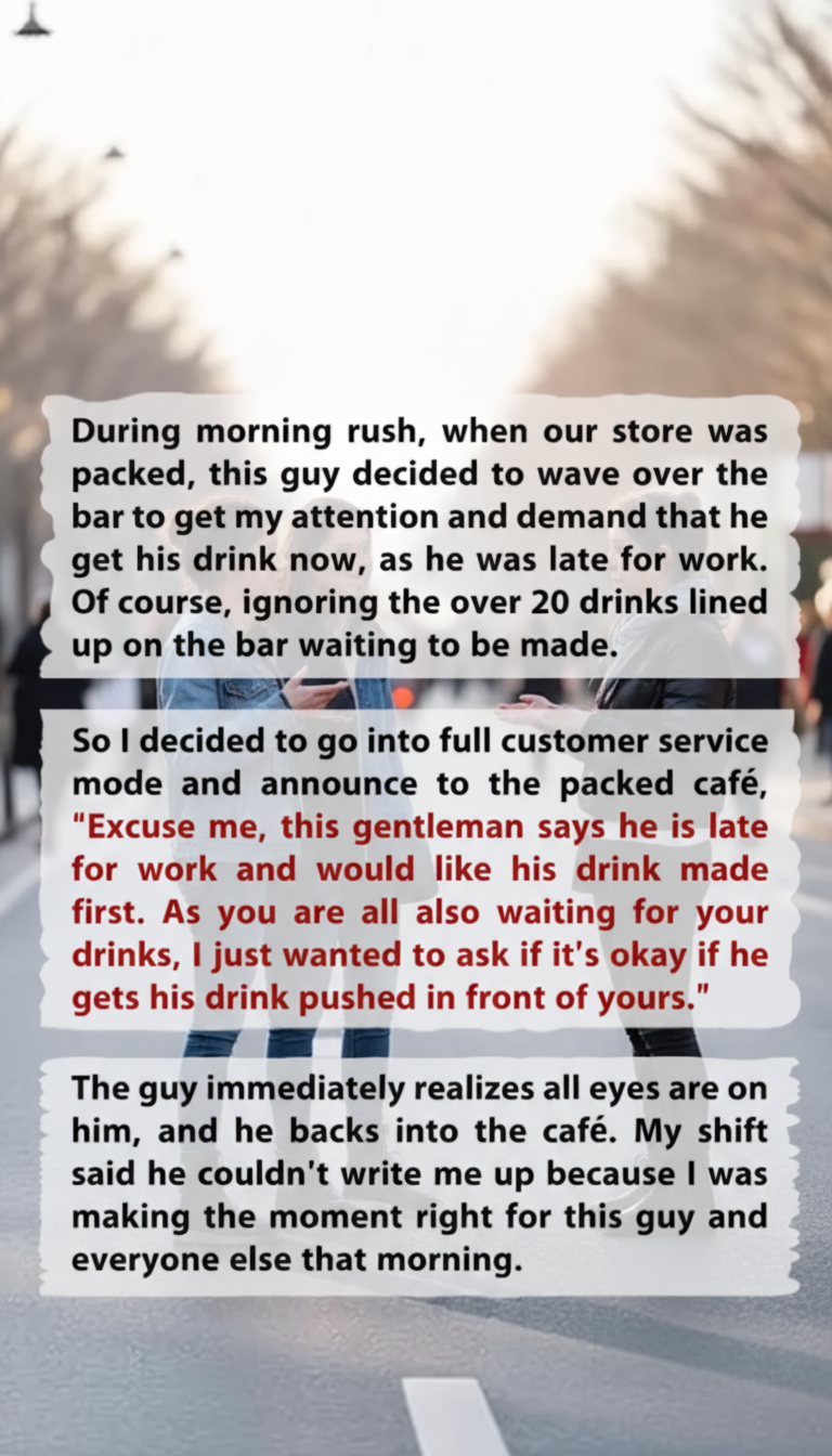 It was the morning rush, and our café was packed—orders stacked, steam rising, the usual chaos. I was deep in the zone when a man waved over the bar, demanding his drink immediately because he was late for work. He ignored the 20+ drinks already queued, as if his urgency trumped everyone else’s. I took a breath, smiled, and went into full customer service mode. Loudly, I addressed the room: “Excuse me, this gentleman says he’s late and would like his drink made first. As you’re all waiting, is it okay if he skips ahead?” The café went silent.