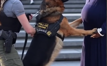 According to eyewitnesses, the female K9 handler appeared to be struggling with the dog moments before it surged forward, planting its front paws against the woman’s stomach. The German Shepherd, outfitted with a “POLICE K9” harness, was reportedly barking aggressively as the handler attempted to regain full control.